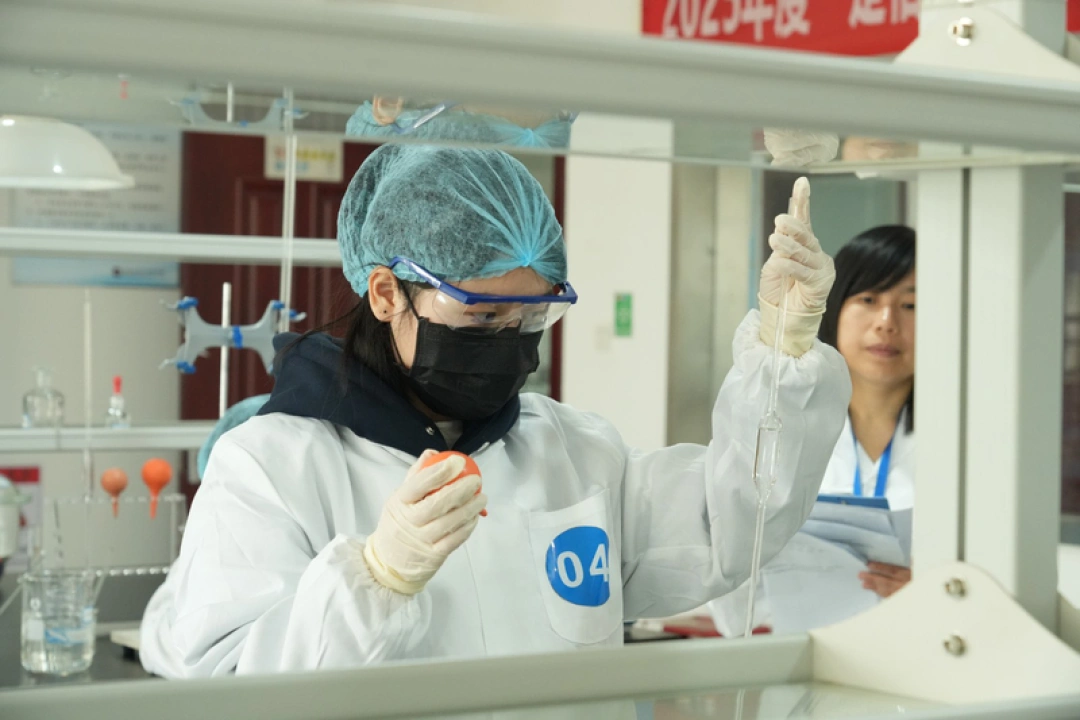 食品药品检验(中职组)赛项分为理论考试、虚拟仿真考试、实操考试,考察选手在食品药品检验检测、食品药品质量管理、食品药品安全风险控制、食品药品生产现场管理等岗位具备的基本理论知识、专业技能和职业素养。竞赛中,选手们对样品进行了细致入微的分析与检测,不仅体现了他们对专业知识的掌握程度,也彰显了未来食品药品行业从业者的责任感。